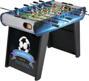 Cette table de baby-foot convient aux enfants mais aussi aux adultes souhaitant se divertir en famille ou entre amis. C’est un matériel de jeu solide puisqu’il est fabriqué avec des planches MDF ayant 12 mm d’épaisseur. Ses poignées en caoutchouc sont à la fois ergonomiques et confortables pour les mains. Des tampons sont prévus pour absorber les chocs produits par les barres. Deux balles sont offertes lors de l’acquisition de ce baby-foot.