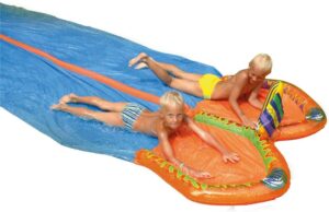Moins onéreux que le précédent, ce ventriglisse mesure 6 m de long et 1 m de large. Fabriqué en PVC extrêmement épais, il semble aussi robuste que le modèle Slip’n Slide. Cependant, il est accessible aux enfants de moins de 5 ans car il s’équipe d’un boudin rempli d’eau pour amortir l’arrivée des petits aventuriers.